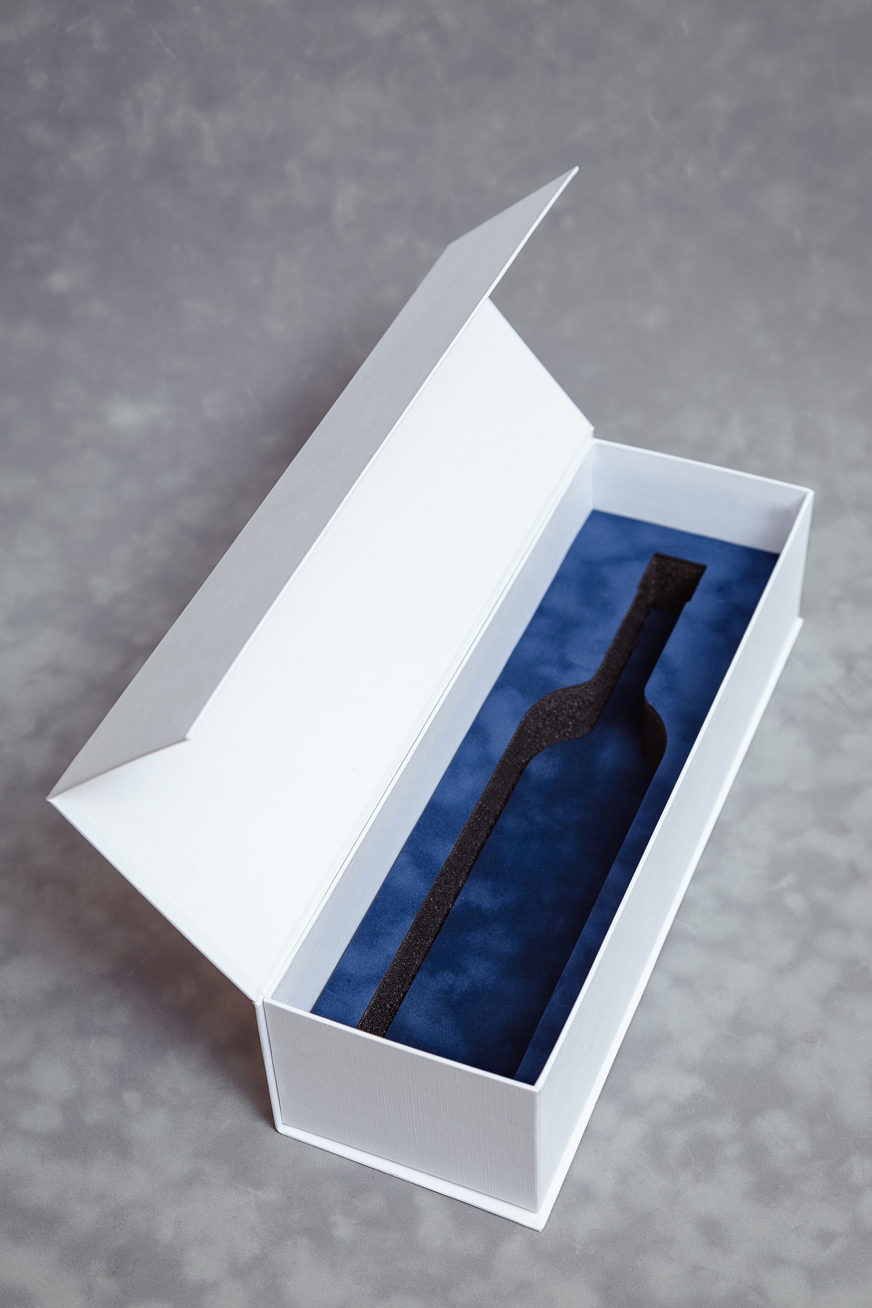 Ложемент из ППУ, обтянутый велюром, с идеальным повтором геометрии бутылки — гарантия сохранности и фиксации.
